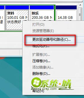3、磁盘列表中找到没有分配盘符的驱动器,在该分区上单击右键,选择“更改驱动器盘符和路径”;