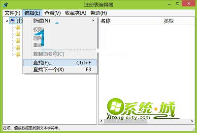 2、在出现的注册表编辑器界面,点击“计算机”,然后点击“编辑”,菜单中点击选择“查找”;