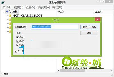 3、在出现的查找界面,在查找目标里面输入“Max Cached Icons(汉语意思是图标缓存最大值)”后回车;