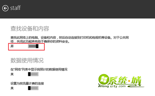 在打开的网络设置中,找到“查找设备和内容”选项,此选项处于“开”状态为专用网络,处于“关”状态则为公用网络,我们需要手动将其开启;