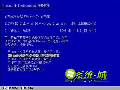 这里对所选分区可以进行格式化,从而转换文件系统格,或保存现有文件系统,有多种选择的余地,但要注意的是NTFS格式可节约磁盘空间提高安全性和减小磁盘碎片但同时存在很多问题OS和98/Me下看不到NTFS格式的分区,在这里选“用FAT文件系统格式化磁盘分区(快),按“Enter”键回车。