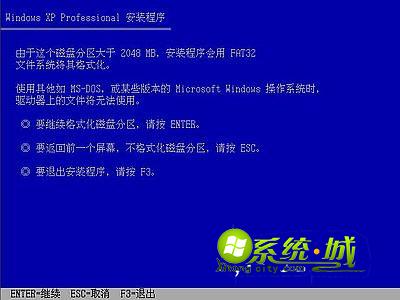 由于所选分区C的空间大于2048M(即2G),FAT文件系统不支持大于2048M的磁盘分区,所以安装程序会用FAT32文件系统格式对C盘进行格式化,按“Enter”键回车。