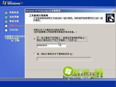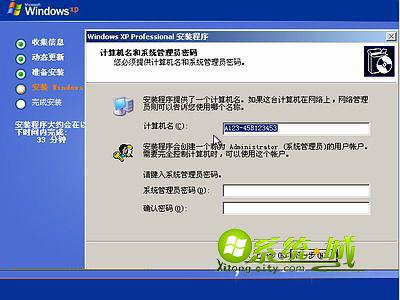 安装程序自动为你创建又长又难看的计算机名称,自己可任意更改,输入两次系统管理员密码,请记住这个密码,Administrator系统管理员在系统中具有最高权限,平时登陆系统不需要这个帐号。接着点“下一步”出现如下图。