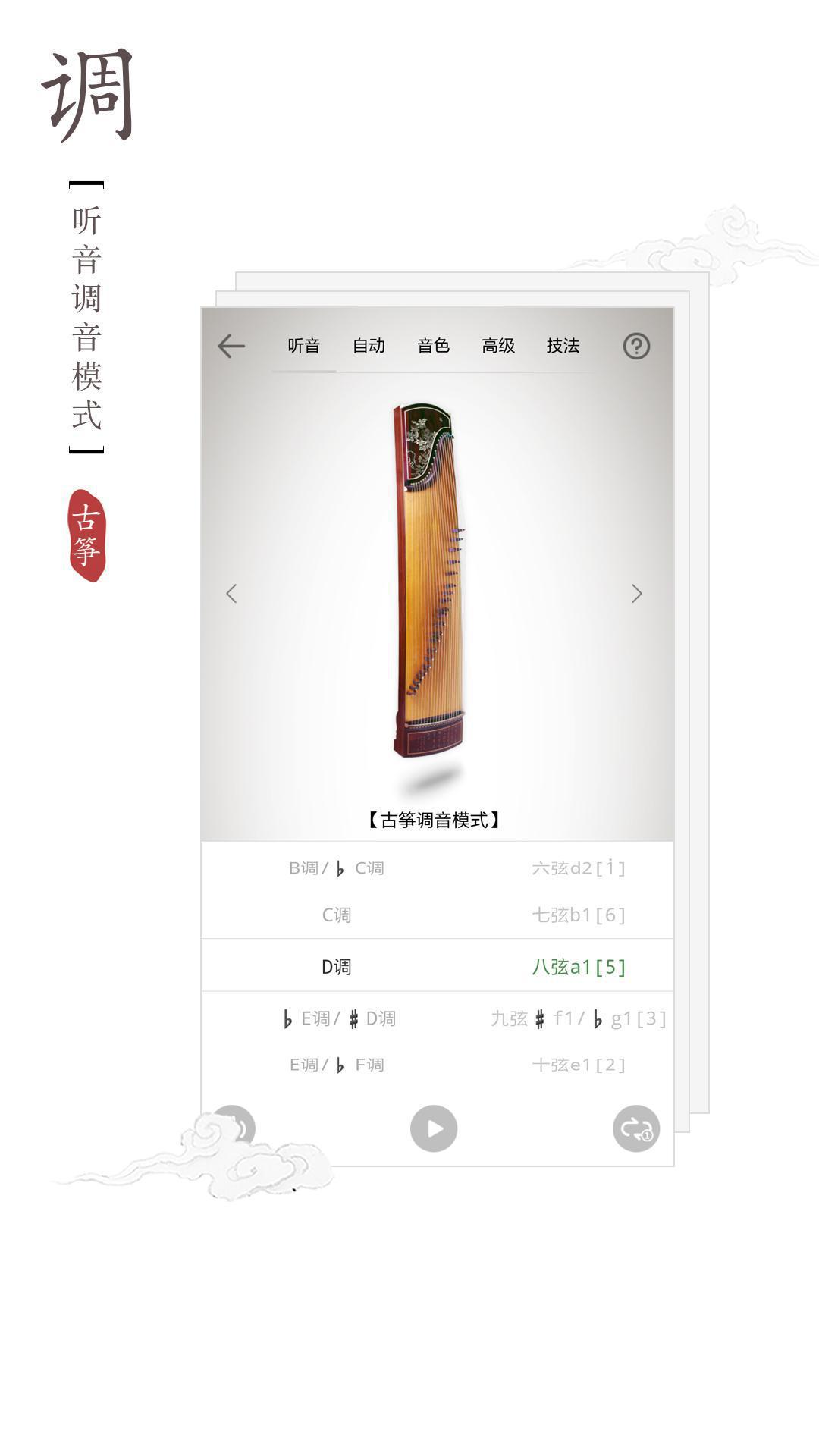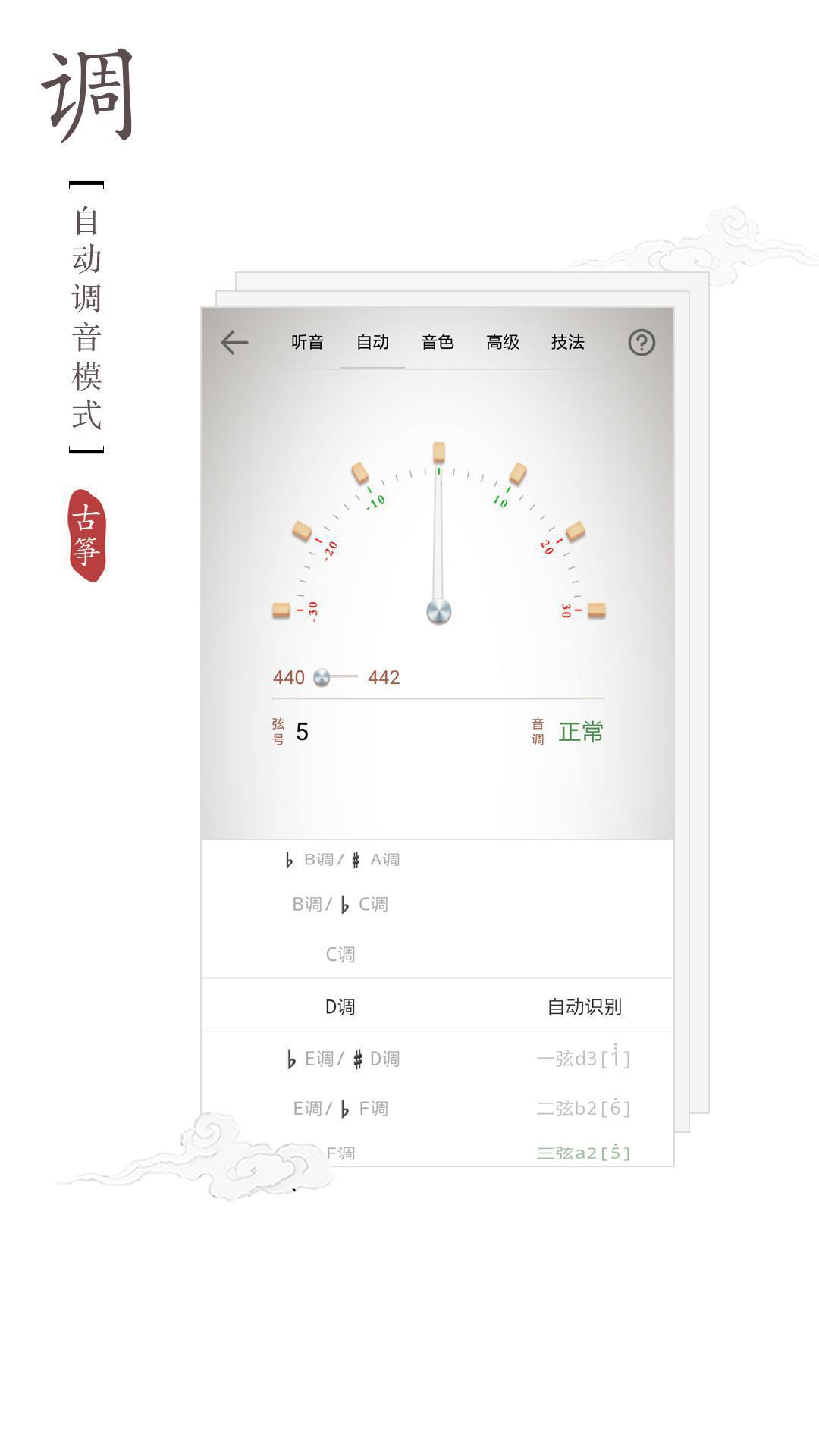 1、调音器提供:听音模式、自动定弦、调音色、十二平均律校音、古筝技法,共5种调音模式;