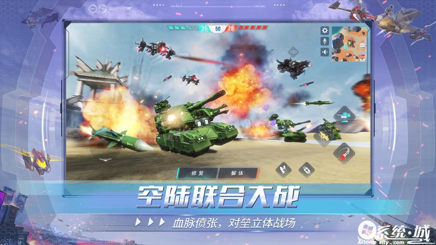 3.随意组装,创造设计方案。超级战车,喷涌四轴飞机,甚至超大到达?!无限无束缚,创造独特的作战机械设备。