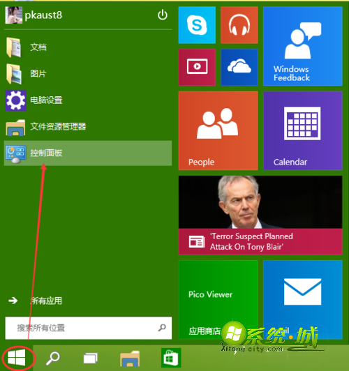 1、点击Win10系统的开始菜单,然后点击控制面板;