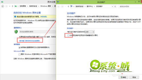 5、点击更改设置界面里的维护窗口期间将自动安装更新,打开自动维护,将允许预定维护在预定时间唤醒我的计算机前面的钩子去掉,然后点击确定。