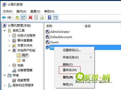 2、展开本地用户和组,点击“用户”,选择需要更改的账户,右键“重命名”,如图所示。