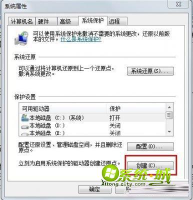 3、在弹出的“系统保护”选项卡中找到“立刻为启动系统保护的驱动器创建还原点”,然后单击“创建”;