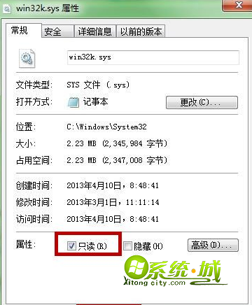 步骤六、关闭记事本右键单击“TesSafe.sys”键,将文件属性修改为“只读”,再点击“应用”确定即可。