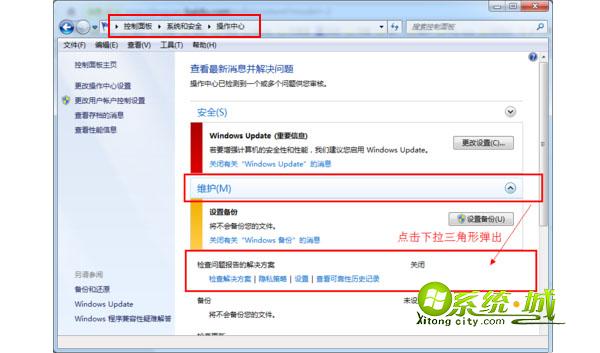 5、点击“开始”打开“控制 面板”,在控制面板我们依次进入→系统和安全→操作中心,点击“维护”栏右边的下拉箭头;