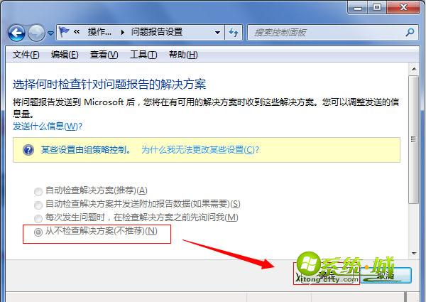 6、弹出“解决问题的检查解决方案”选项,点击下方“设置”进入 “问题报告设置”窗口,这里我们点选“从不检查解决方案”然后确定即可。
