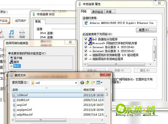推荐:雨林木风win7系统下载1、可以在网络协议处增加它,首先找到本地连接,然后右击选择“属性”,在打开的属性界面中,点击“Internet协议版本4”,然后在打开的选择网络功能中点击协议,然后路由选择c:windowsinf找到1394.nif,如下图所示;