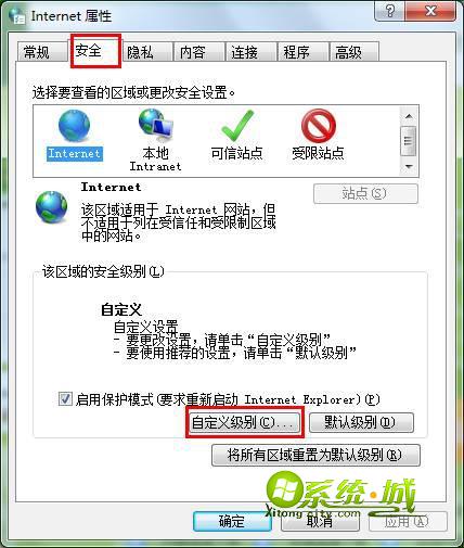 2、再切换到“安全”选项卡,点击“自定义级别”;