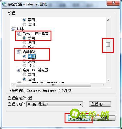 3、将“java小程序脚本”和“活动脚本”勾选为“禁用”,再点击“确定”保存并退出即可。