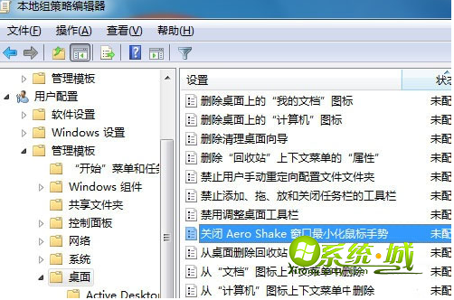 2、在“组策略编辑器”中依次打开“用户配置—管理模块—桌面”,然后在窗口右侧区域中双击“关闭Aero Shake窗口最大化最小化鼠标手势”;