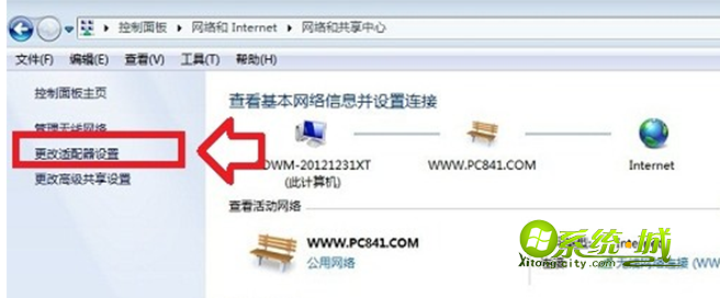 2、进入Win7系统的网络共享中心后,点击左侧的“更改网络适配器”;