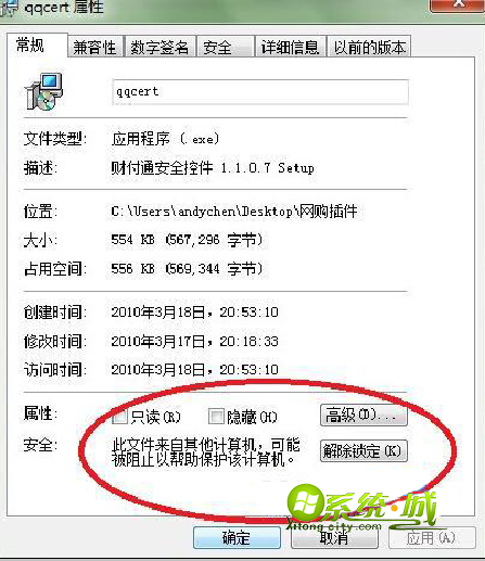 2、取消提示框方法是:在你要运行的软件上右击选择“属性”打开的窗口切换到“常规”选项卡,点击“解除锁定”按钮之后点击“确定”即可,再次运行的时就不会再出现这个提示;