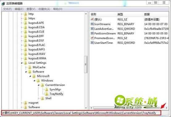2、依次展开注册表编辑器“HEKY-CURRENT-USER\Software\Classes\Local settings\Software\Microsoft\Windows\CurrentVersion\TrayNotify”项;
