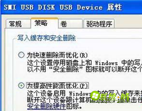 4、在弹出的属性面板中切换到“策略”选项卡,便可看到系统默认的“为快速删除而优化”项,更改为“为提高性能而优化”即可。