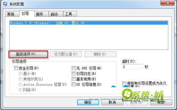 2、切换到“引导”系统标签,点击“高级选项”按钮,弹出“引导高级选项”界面;