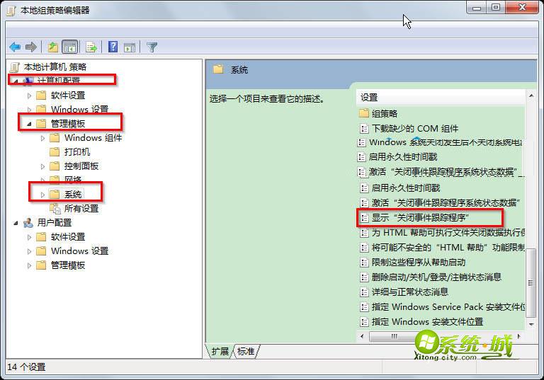 2、在本地组策略编辑器界面中,依次展开:计算机配置 > 管理模板 > 系统 ,点击“系统”,找到并打开显示“关闭事件跟踪程序”;