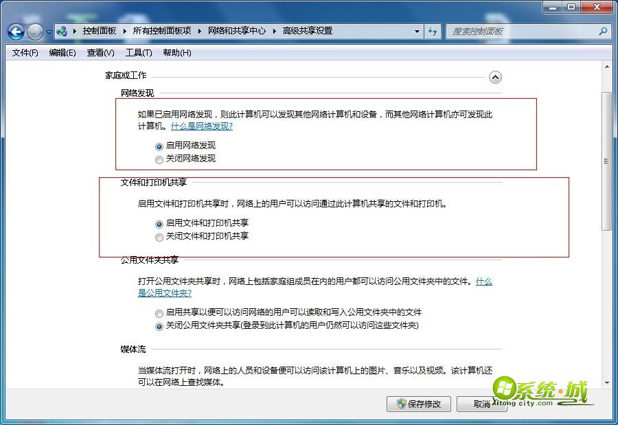 3、桌面右键点击网络,弹出菜单选择属性----打开网络和共享中心----在更为网络设置地方点击“选择家庭组和共享选项”——更改高级共享设置,打开“家庭或工作”,然后在“网络发现”中选“启用网络发现”,在“文件和打印机共享”选“启用文件和打印机共享”,在“密码保护的共享”选“关闭密码保护共享”。