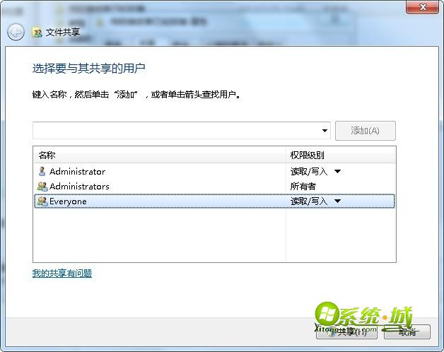 4、右键点击要共享的文件夹---弹出菜单选择“属性”---共享--高级共享--权限,选“everyone” ,然后添加,权限级别设置为“读取”或者“读/写”,然后点击共享就可以了。(如果要取消,就进入“高级共享”,去掉“共享”的勾就可以了)