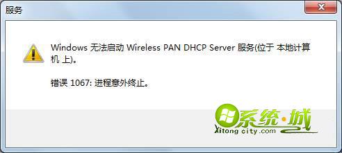 Win7系统操作过程中难免遇到一些小问题,最近有些用户连接无线网络,一直无法成功。弹出服务提示窗口“windows无法启动wireless pan dhcp server服务(位于本地上)错误1067:进程意外终止。遇到此类故障问题该如何解决呢?下面一起看看具体解决方法。