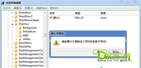 3、将Shell项下的Find项都删除。这时屏幕弹出一个确认项删除提示窗口“确实要永久删除这个项和所有其子项吗”,直接点击“是”按钮。