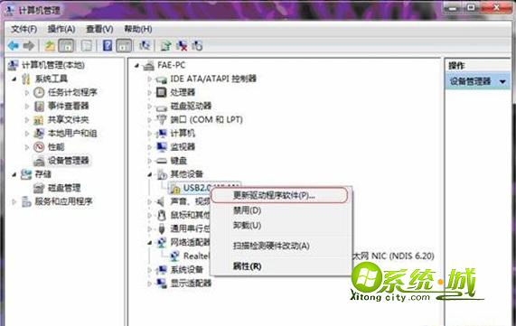 2、找到出现黄色感叹号的设备,右键选择“更新驱动程序软件”;