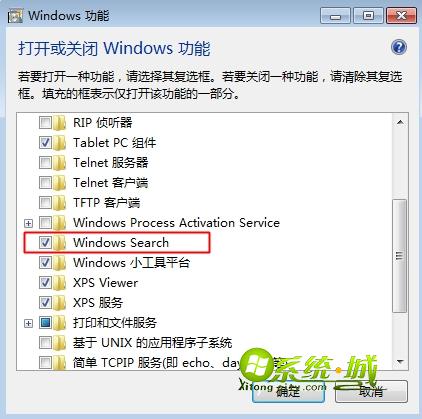 2、找到Windows Search,如果没有勾选则勾选上,重启系统;