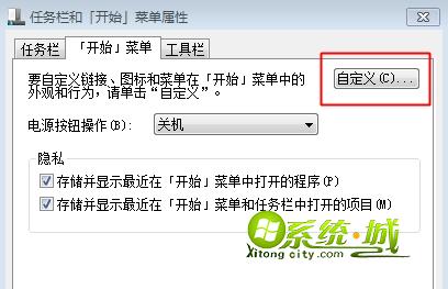 4、如果问题依旧,那么右键单击开始按钮,选择“属性”, 在“开始菜单”选项卡中点击“自定义”按钮;