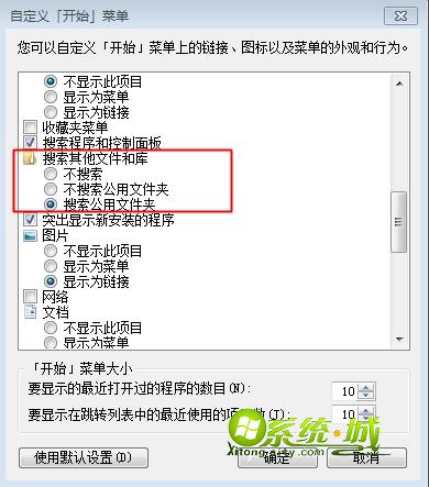 5、找到“搜索其他文件和库”,选择“搜索公用文件夹”,确定。