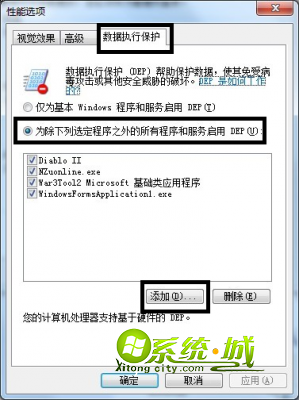 选择“数据执行保护”,选择“为除下列选定程序之外的所有程序和服务启用DEP(U)”,再点击下方的“添加”从硬盘中选中该程序即可。