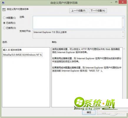 1、修改UA字符串:启用“超级管理工具”—“组策略”,具体操作:“win+R键”打开运行→“gpedit.msc”→计算机配置→管理模板→Windows组件→Internet Explorer→自定义用户代理字符串→打开→选择已启用→输入IE版本字符串→Mozilla/5.0;