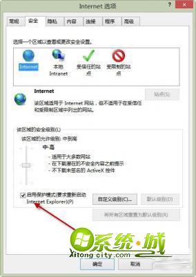 2、关闭保护模式:视频无法使用的问题,则需要关闭IE11的保护模式“Internet选项”→安全→去掉启用保护模式前边的勾。需要注意的是关闭IE的保护模式会带来一定的风险问题,所以此操作需谨慎;