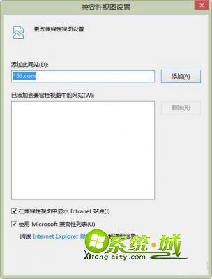 3、添加到兼容性视图列表:IE还带有兼容性视图,不兼容的网站所准备的“Internet”→菜单栏→工具→兼容视图设置→将该网站网址加入。