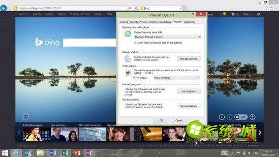 8、默认使用桌面版IE,Windows 8.1仍然内置了两个版本的IE浏览器,十分烦人。你可以选择使用触屏版的IE11,只需在IE的选项中,选择“应用”项目,选择“在桌面上打开IE瓷砖”。