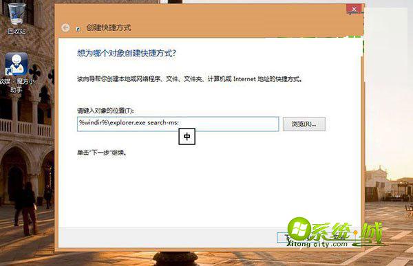 2、在键入对象位置框内,输入“%windir%\explorer.exe search-ms”;