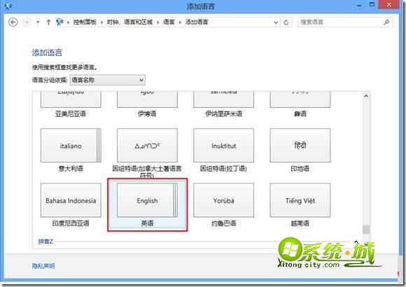 2、在“拼音Y”中找到“英语”(英文系统可直接查找英文语言首字母),双击打开;