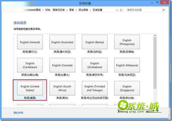 3、在打开的窗口中选择具体的语言区域,如本文的“英语(美国)”,完成添加;