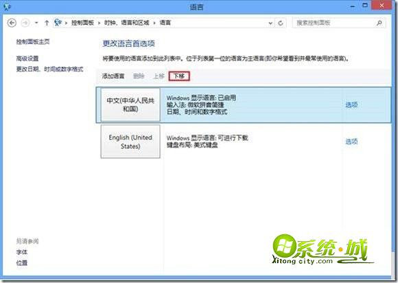 4、回到语言设置界面,单击选中“中文(中华人民共和国)”后点击“下移”;