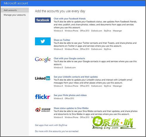 推荐:纯净版Ghost win8系统下载1、打开添加帐户页面,国内用户默认为简体中文页面,仅能看到新浪微博、Linkedin和Google三个帐户选项;