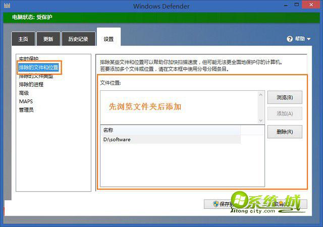 5、点击“设置”选项卡,在左侧就有相对应的例外设置。如果要排除某一个文件夹,点击“排除的文件和位置”,在“文件位置”右侧点击“浏览”选择要排除的文件夹后,点击“添加”,然后点击“保存更改”;
