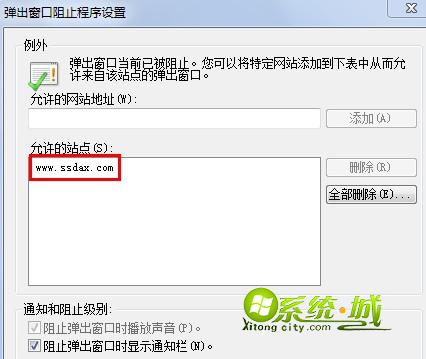 2、在“要允许的网站地址”中输入网址,点击“添加”,添加后会在“允许的站点”列表中显示;