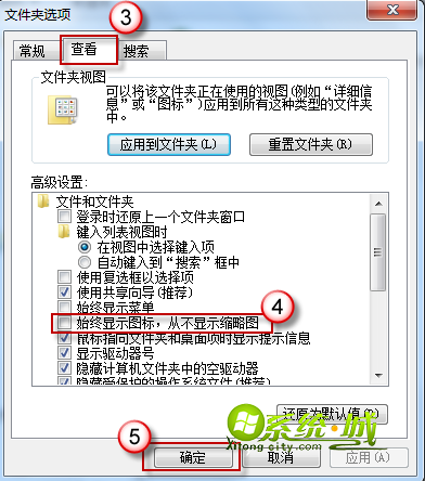 2、在新窗口中单击查看,然后确保始终显示图标,从不显示缩略图这个选项不被勾选。并点击确定;