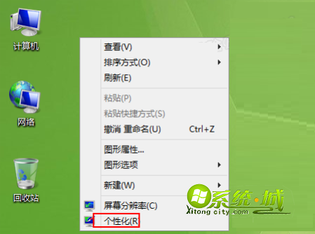 推荐:Ghost win8系统下载1、右击桌面空白地方,选择“个性化”;