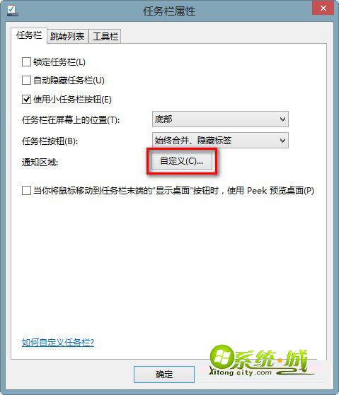 1. 在任务栏空白处右键单击选择属性,在打开的“任务栏属性”对话框中,点击“任务栏”选项卡下的“自义”按钮;