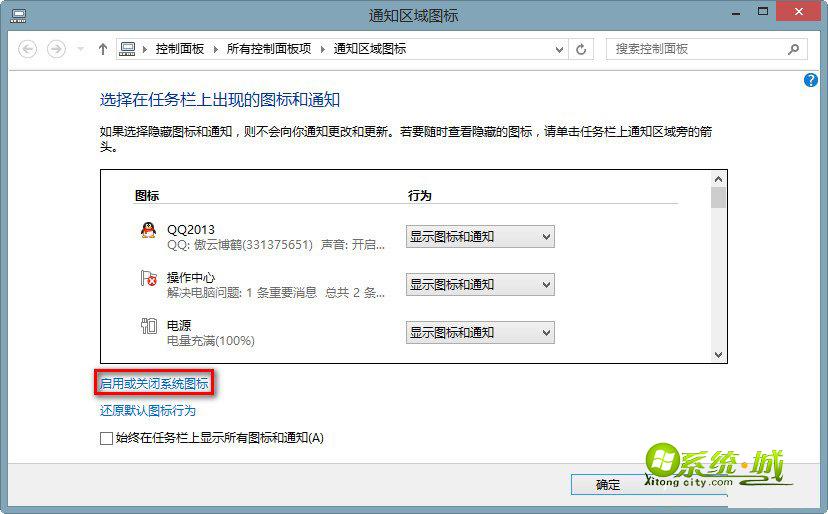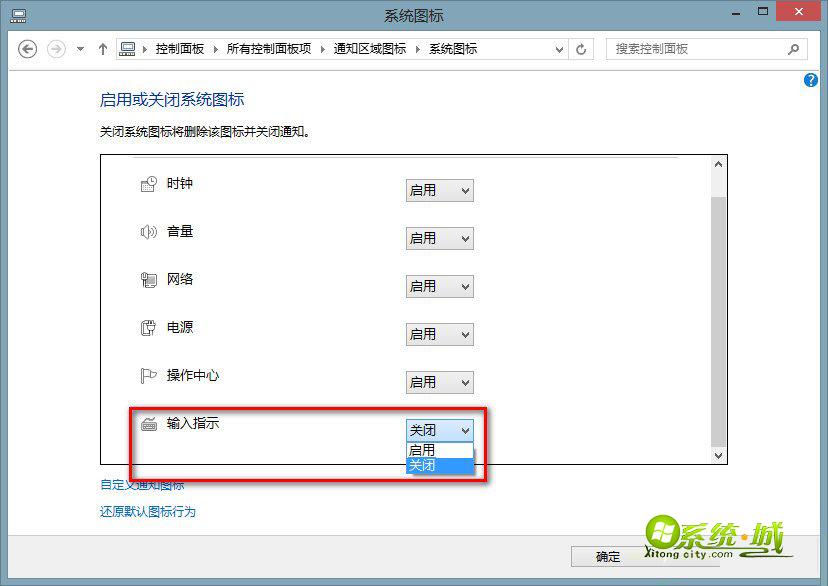 3. 从弹出的“系统图标”窗口下,可找到“输入指示”选项,将行为“关闭”修改为“启用”即可。